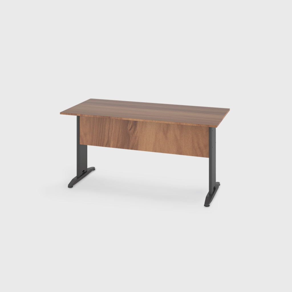Amplo tampo valoriza uma ambiência mais discreta. Os pés centralizados permitem melhor acomodação. A estrutura permite pés com calhas para a passagem de fios.