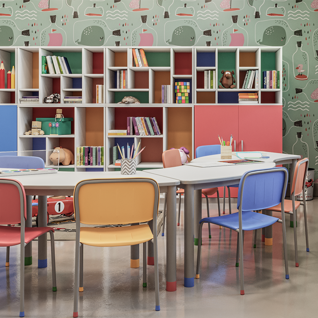 Quando as crianças recebem a liberdade de participar coletivamente elas se ajudam e se desenvolvem no trabalho em grupo. a linha de mesa curva ajudará o aluno a usar sua Imaginação enquanto aprende e a partilhar seu conhecimento. As crianças respeitam os outros e controlam suas emoções e energia.