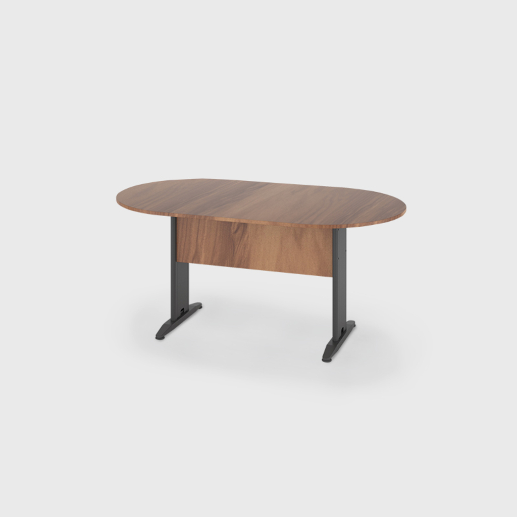 Tampo de design dinâmico permite um ambiente de reunião mais descontraído. Os pés centralizados permitem melhor acomodação. A estrutura permite pés com calhas para a passagem de fios.