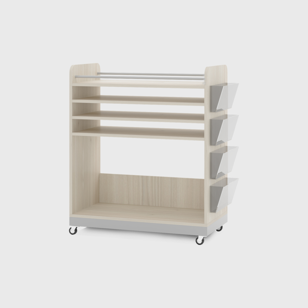 Comporta rodízios facilitando o manuseio e o deslocamento do produto sempre que for necessário. Possui compartimentos que podem ser utilizados, para armazenamento de materiais artísticos em sala de aula.