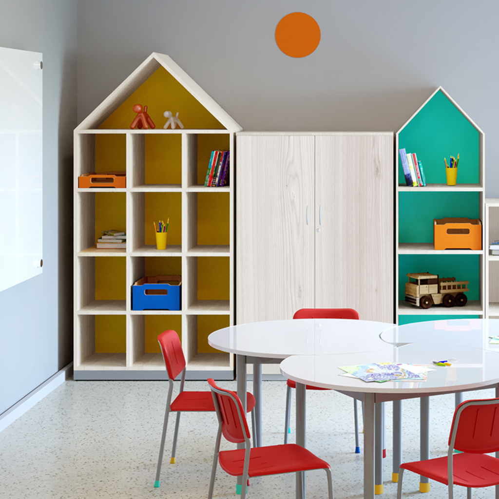 Renova o ambiente pedagógico, com nichos que podem ser utilizados para acomodar livros, materiais escolares e caixas organizadoras.