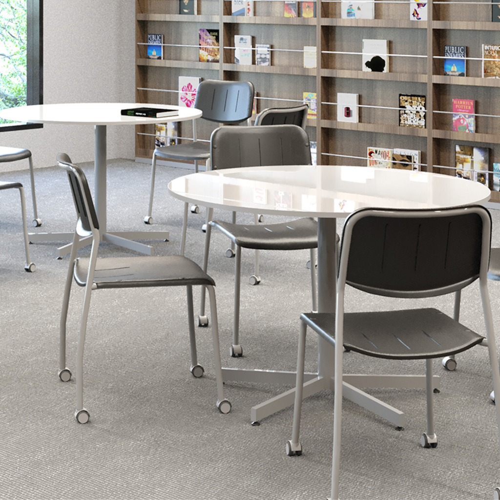 A mesa escolar redonda foi redesenhada para oferecer uma solução prática e versátil. Com uma base centralizada, ela permite maior mobilidade para o usuário. No seu maior tamanho, a mesa escolar acomoda confortavelmente até 5 pessoas, tornando-se ideal para atividades em grupo e interação entre os alunos. Este design moderno e funcional promove um ambiente de aprendizado dinâmico e eficiente, adaptável a diversas necessidades pedagógicas.