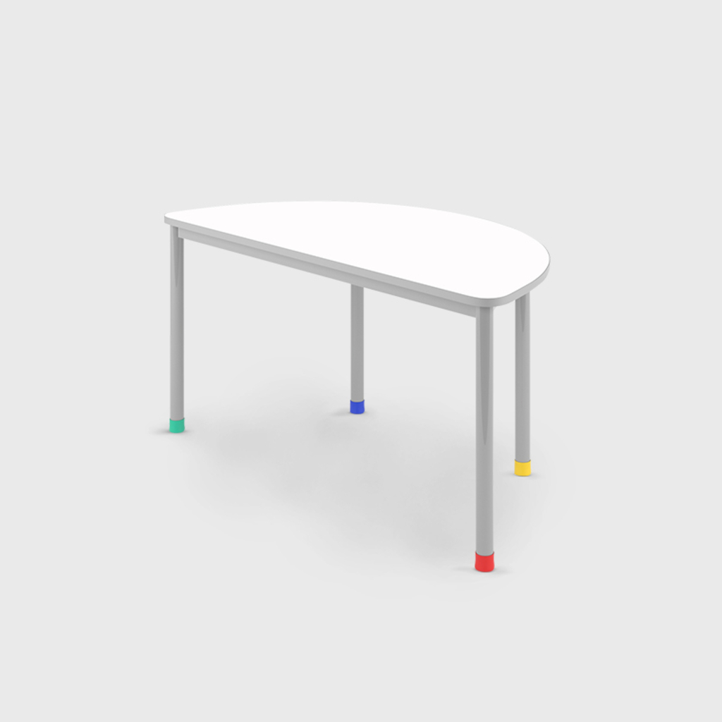 Cada item do mobiliário da sala de aprendizagem deve ser flexível para possibilitar múltiplas funções. A forma em contornos da mesa meia lua possibilita usar as mesas separadamente ou juntas permitindo um espaço colaborativo maior.