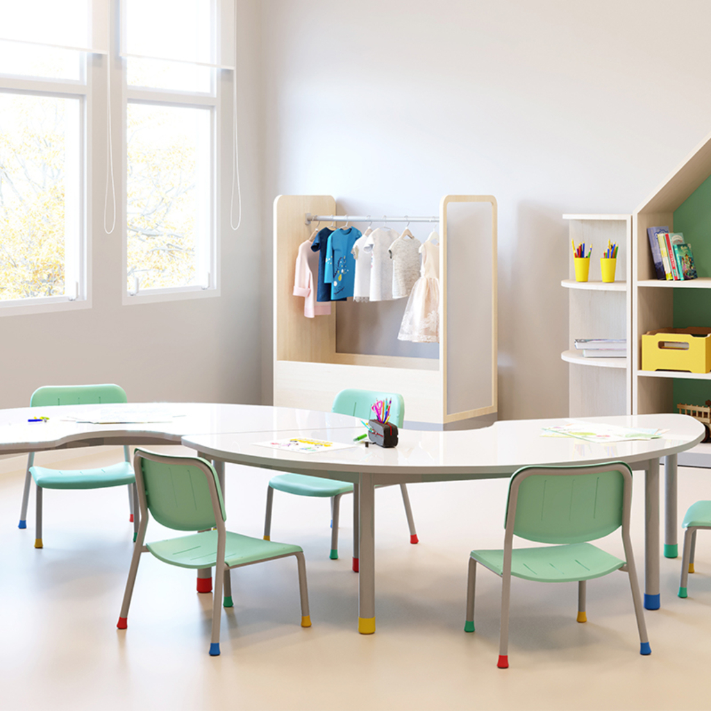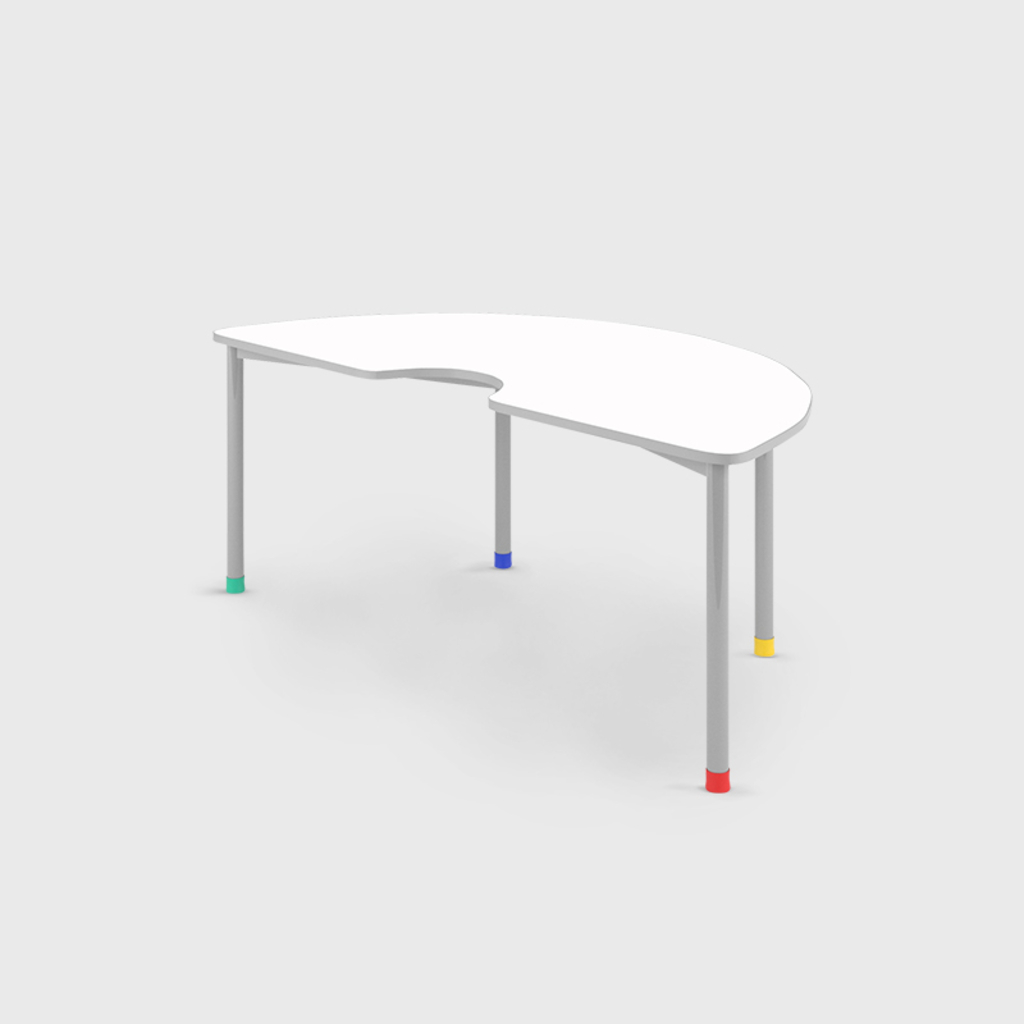 Cada item do mobiliário da sala de aprendizagem deve ser flexível para possibilitar múltiplas funções. A forma em contornos da mesa meia lua possibilita usar as mesas separadamente ou juntas permitindo um espaço colaborativo maior.