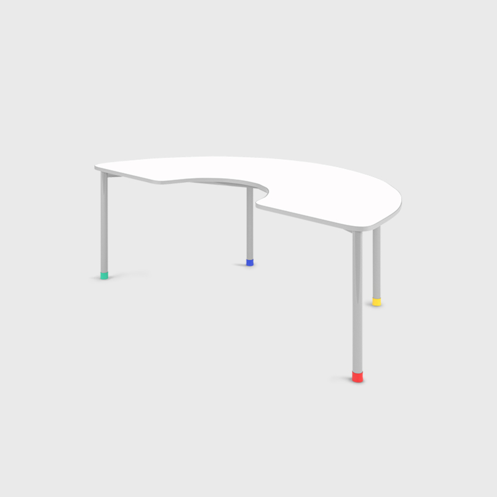 Cada item do mobiliário da sala de aprendizagem deve ser flexível para possibilitar múltiplas funções. A forma em contornos da mesa meia lua possibilita usar as mesas separadamente ou juntas permitindo um espaço colaborativo maior.