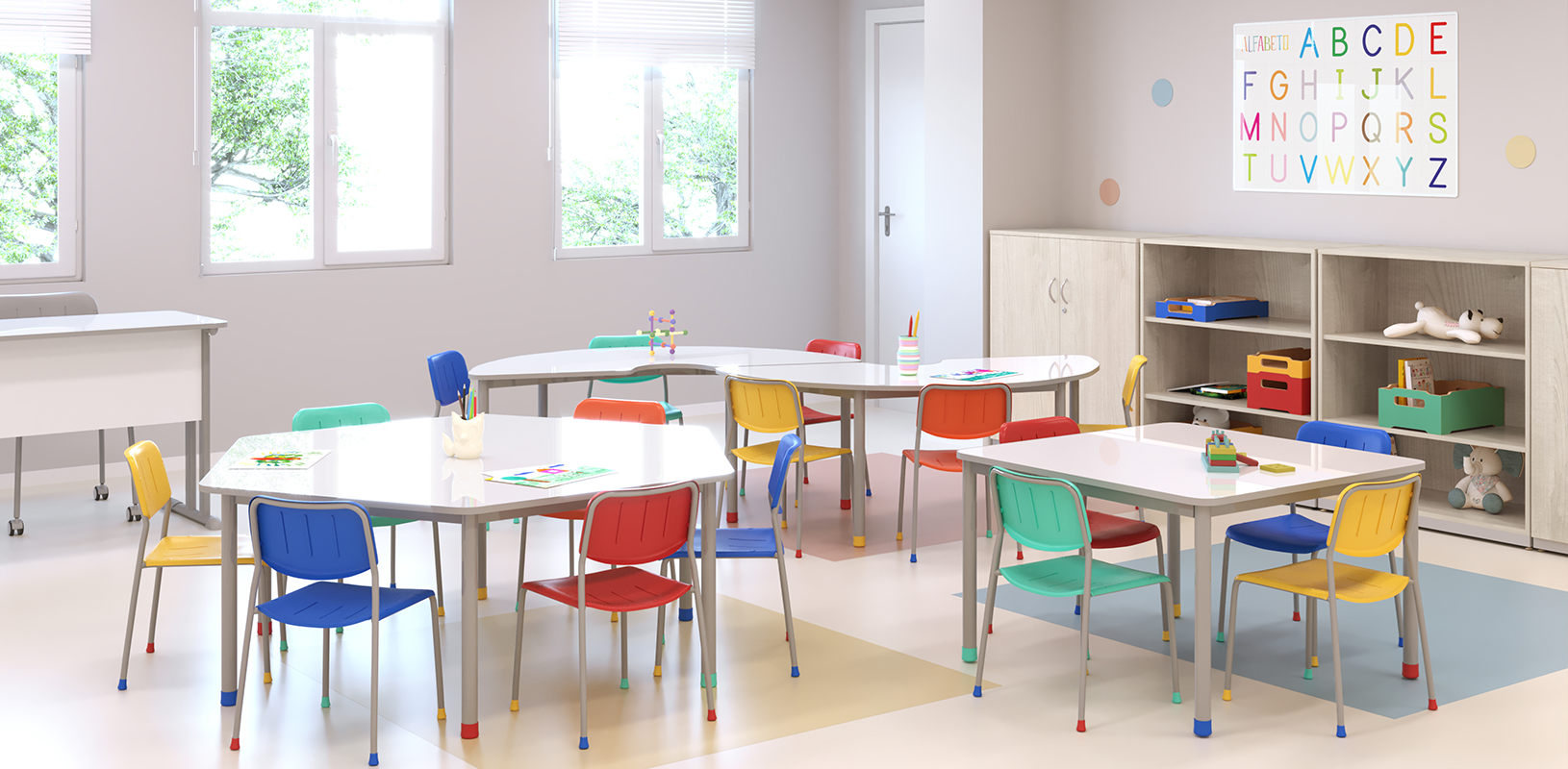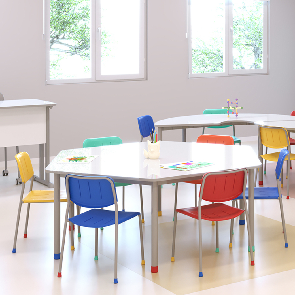 A sala de aula requer um espaço com muitas possibilidades e trabalhos coletivos onde os alunos são participantes ativos no processo de aprendizagem, a mesa coletiva sextavada propõe atividades em coletivo impulsionando o desempenho de alunos.