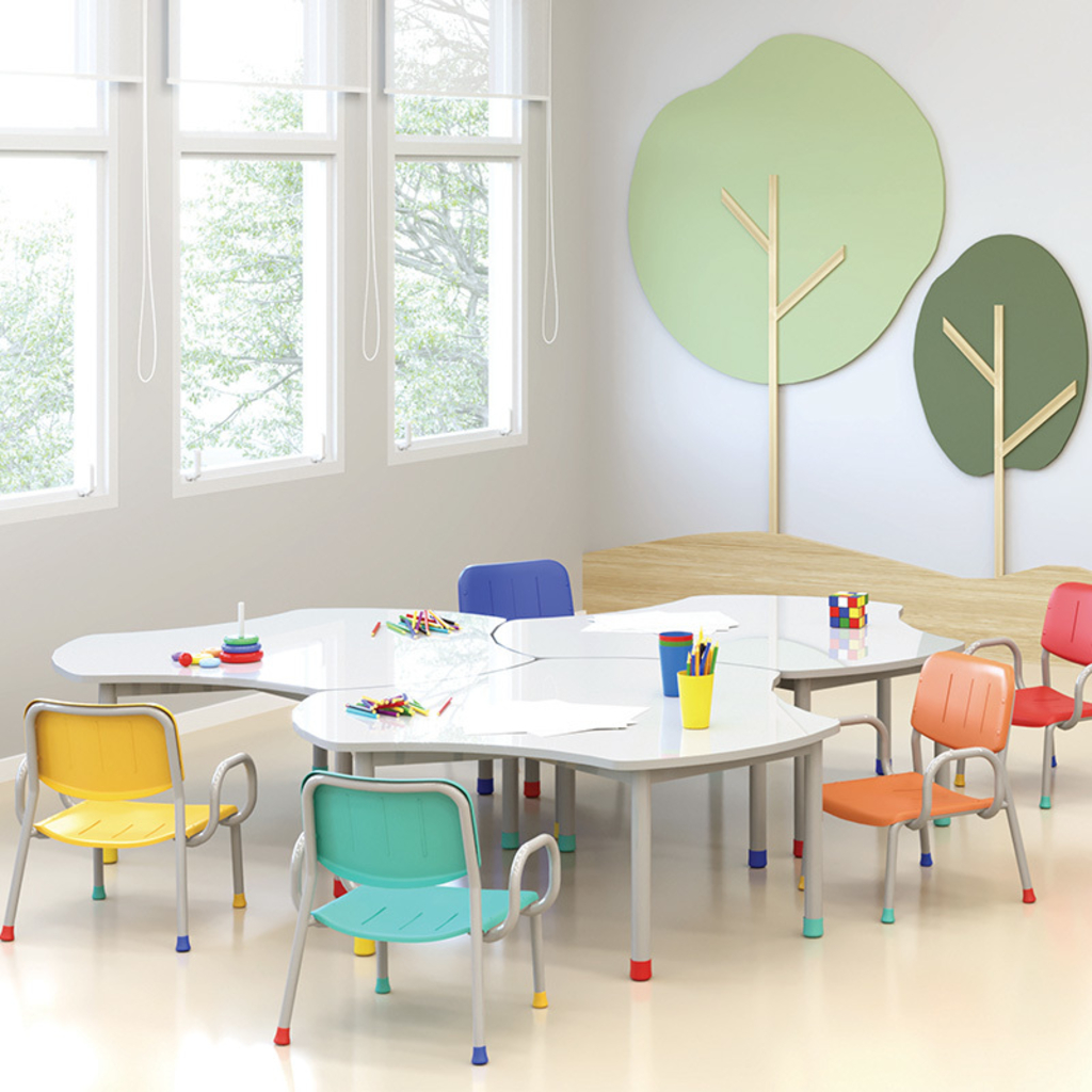 Um design mais atrativos e estimulantes. A mesa trevo permite a possibilidade de diversas configurações de layout, atendendo à necessidade das salas de aulas inovadoras, aumentando o estímulo do aluno.