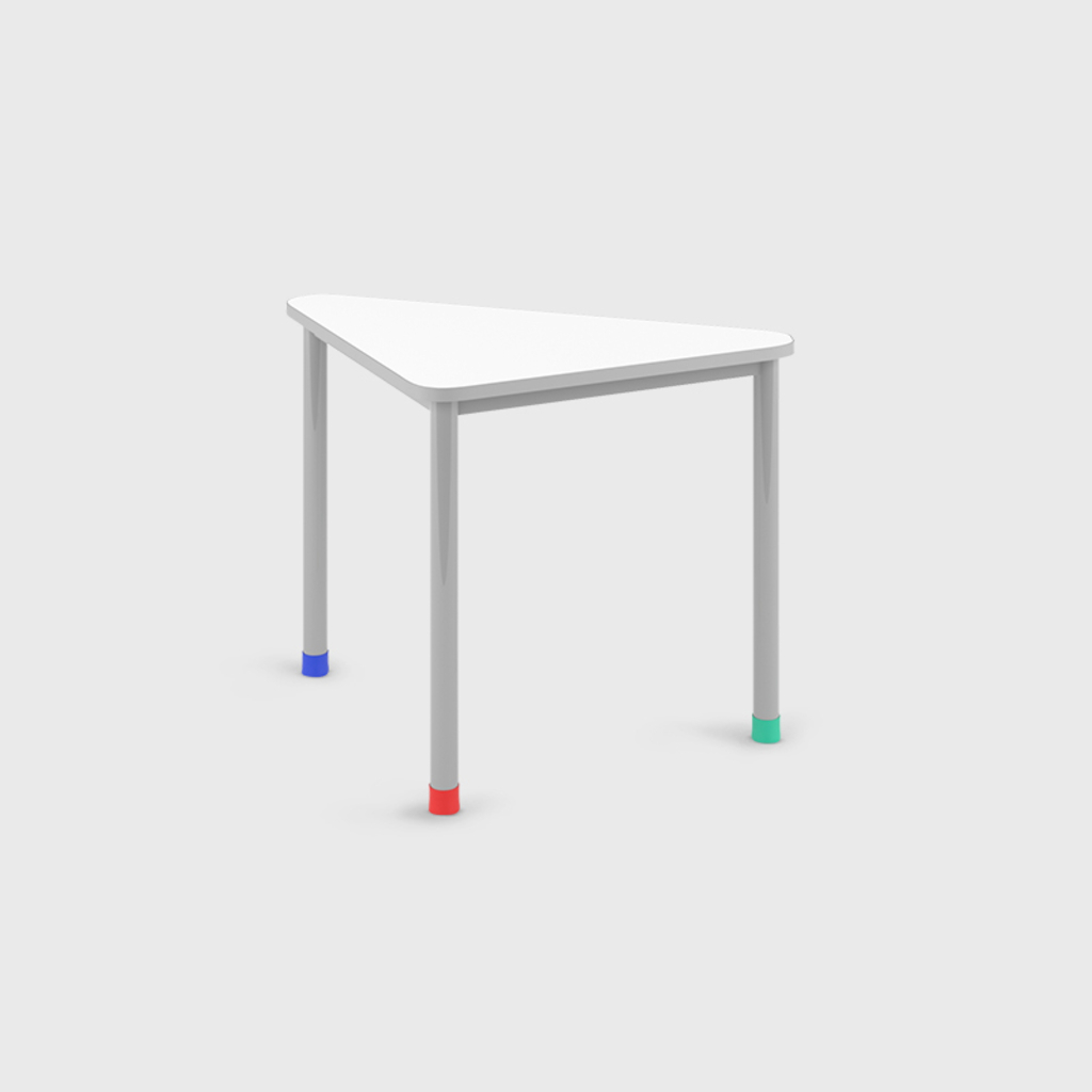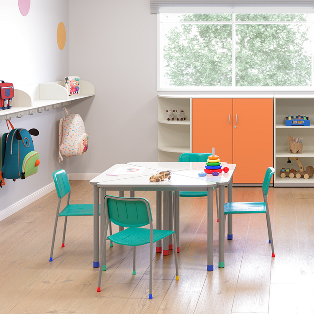 Cada item do mobiliário da sala de aprendizagem deve ser flexível para possibilitar múltiplas funções. A forma em contornos da mesa meia lua possibilita usar as mesas separadamente ou juntas permitindo um espaço colaborativo maior.